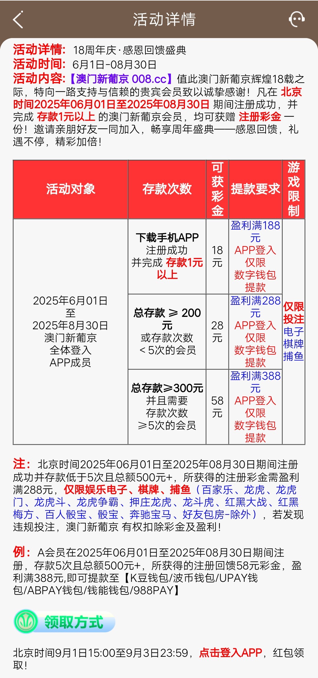 凡在 北京时间2025年06月01日至2025年08月30日 期间注册成功,并完成 存款1元以上 的澳门新葡京会员,均可获赠 注册彩金 一份!